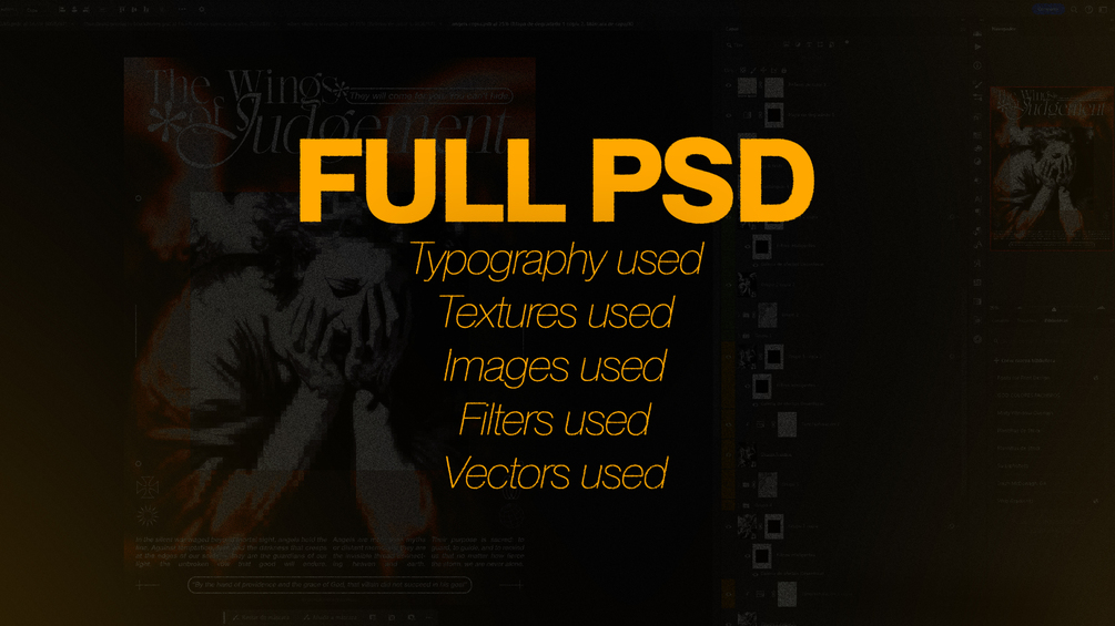 By purchasing this product, you’ll gain access to the PSD file of my Angels – “Wings of judgement” poster designs. The PSD includes all the objects and settings used in the original design, including the typography and images. Feel free to explore and tweak the configurations, gradients, filters, and textures as you wish.