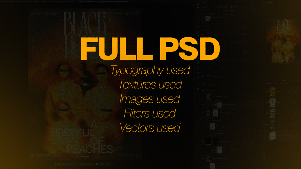 By purchasing this product, you’ll gain access to the PSD file of my Black Honey – “A Fistful of Peaches” poster concept. The PSD includes all the objects and settings used in the original design, including the typography and images. Feel free to explore and tweak the configurations, gradients, filters, and textures as you wish.
